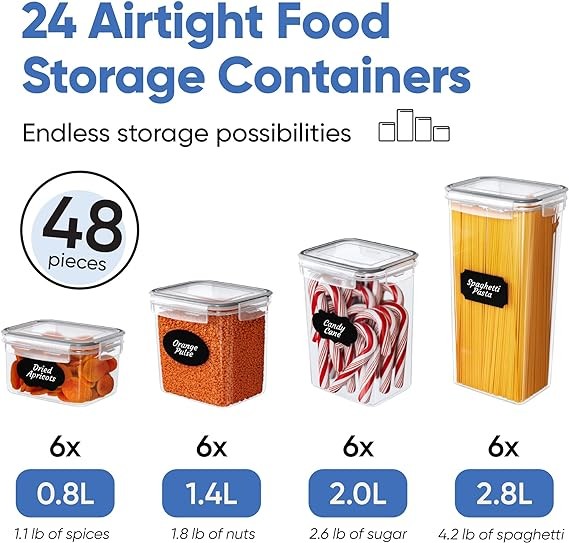 • Kitchen Storage Containers - 24 BPA free food storage canisters included. These airtight food storage containers come with reusable chalkboard labels, a chalkboard marker, and a measuring spoon set.