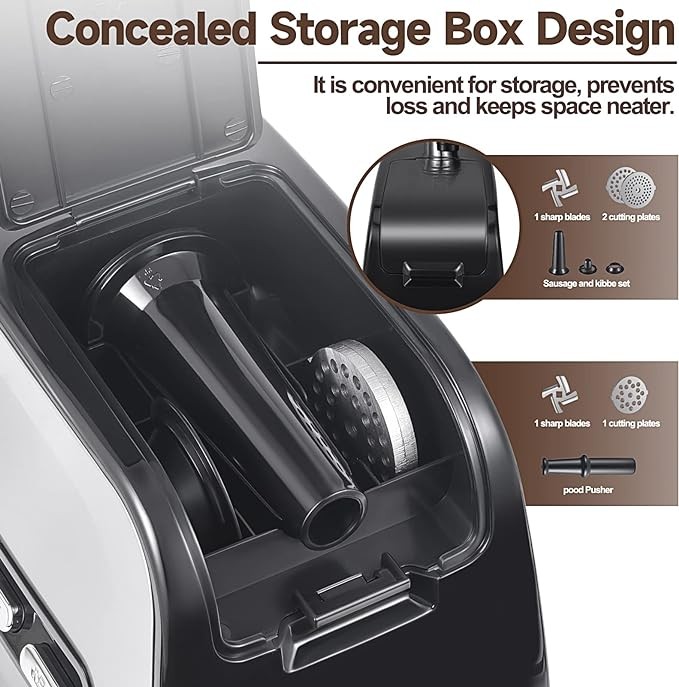 • 【Easy to Operate, Clean & Store, Lifetime After-sales Service】 ①Easy to operate with 3 way on/off/reverse switch. The reverse button is used to unclog the unit. ②The components of this meat grinder machine are easy to disassemble, combine and clean. ③The built-in concealed storage box can be used for the storage of accessories without occupying the place and preventing the parts from being easily lost. ♛Backed by 12 Months ALTRA Basics Warranty♛ 【 Notice 】 All parts can not be washed by dishwash