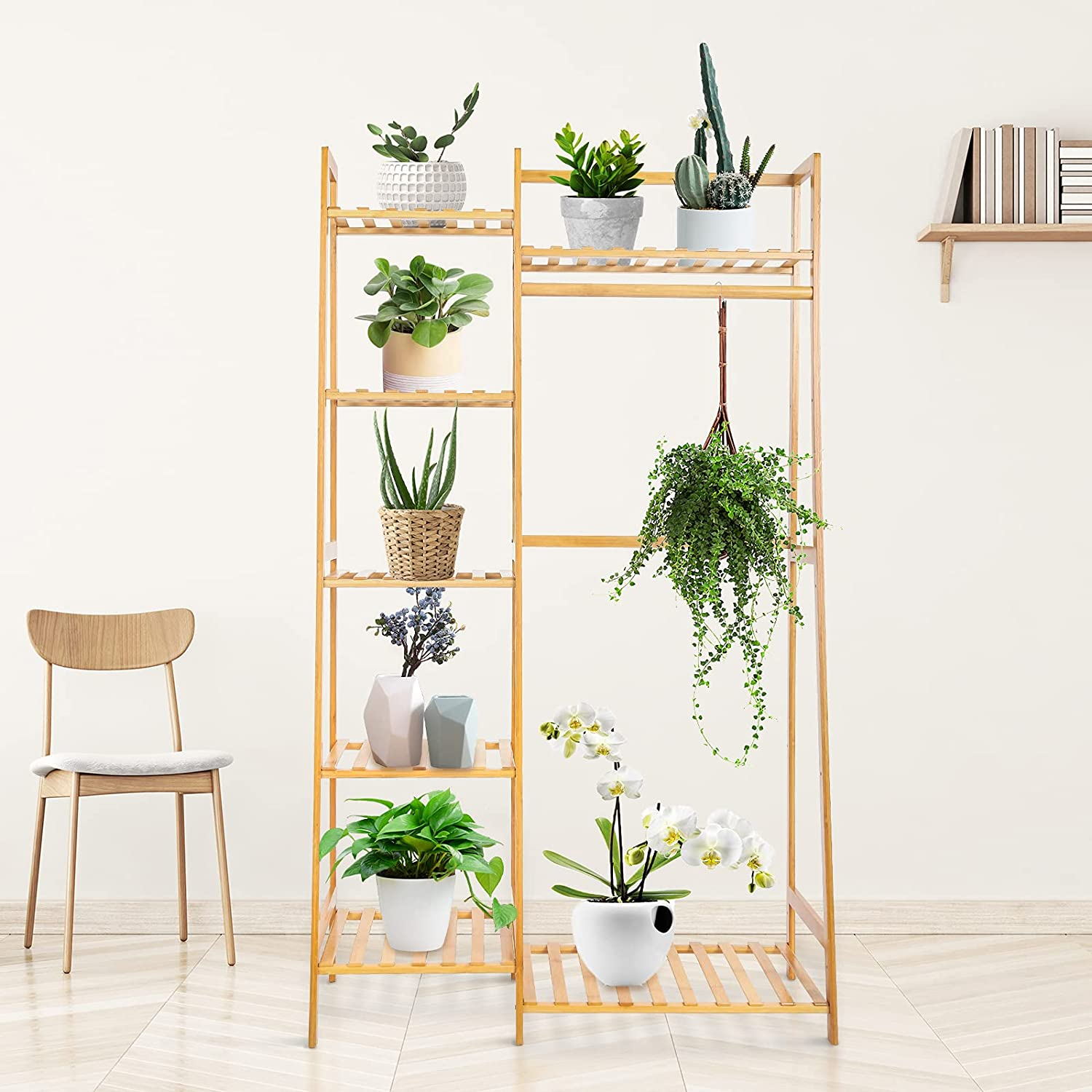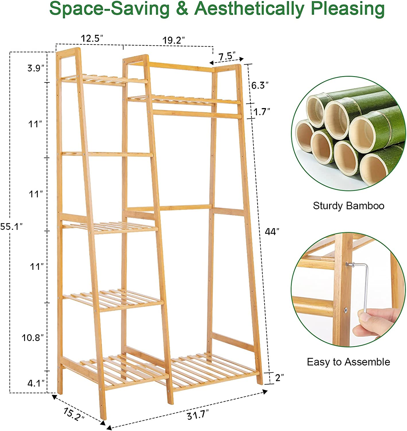 Bamboo Rack with 7 Tier Storage Shelves Clothing Hanging Stand for Small Spaces