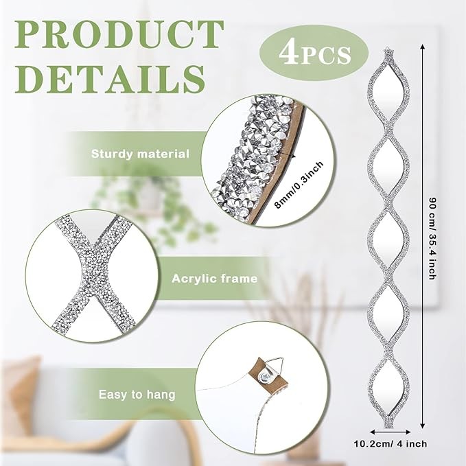 Decorative Mirror Set: you will receive 4 pieces of silver crush diamond teardrop mirror wall decors, each mirror has 1 triangular hook on the back, and our mirror measures about 35.4 x 4 inches/ 90 x 10.2 cm in length and width, 0.35 inches/ 9 mm in thickness, can fulfill your decorative needs