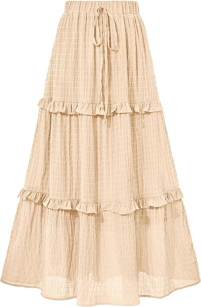 Summer Long Skirts - The Boho A-Line Flowy Swing Tiered Maxi Long Skirt Featured With Decorative Drawstrings, Elastic High Waist, Solid Color, Ruffles Tiered Flowy Skirt, Which Makes The Summer Skirts Simple But Trendy