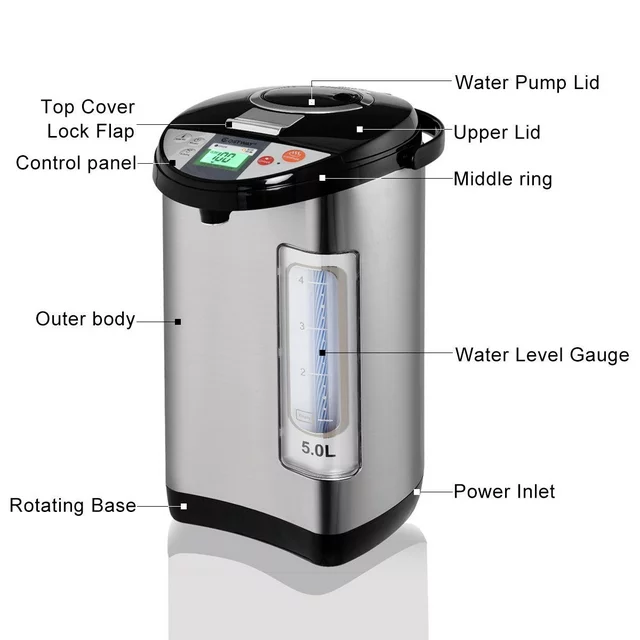Feature Modern and classic appearance Excellent heat preservation and durability Food grade stainless steel, harmless to human being LCD display shows the current water temperature and five stages of temperature Night light indication design, convenient to get water at night 3 different water dispensing methods, one can be operated without power Re-boil function, bring the water back to 212 degree F/ 100 degree C quickly Timer function, make an appointment to set the time for boiling water A glance at the water level will let you know when to refill the water