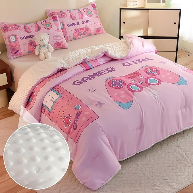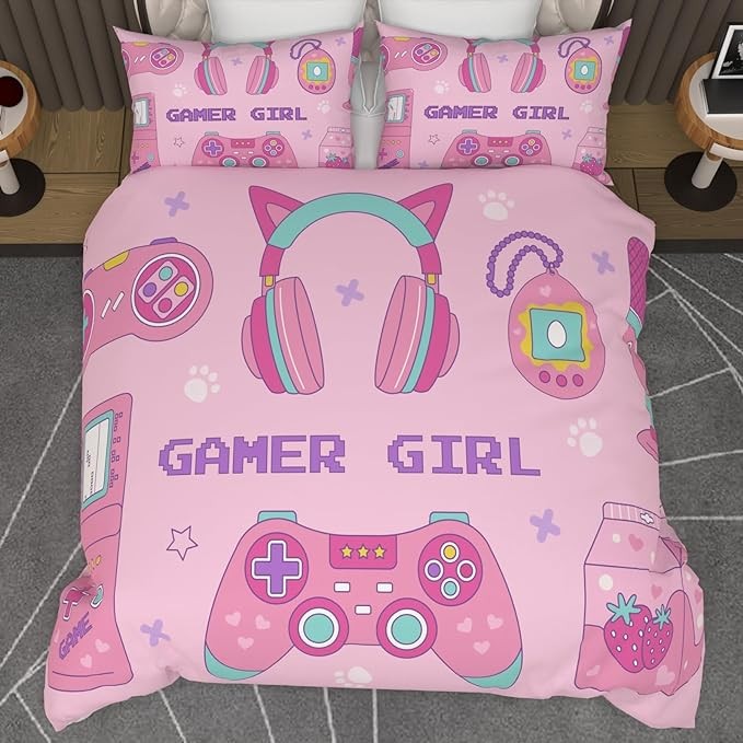 Cyusri Video Game Twin Size Comforter Set for Girls Kids Teens 3D Gaming Controller Pattern Gamepad Print Bedding Set- 3 Piece Pink Quilt with 2 Pillowcases (68"x90")