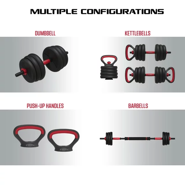 • 4-in-1 interchangeable weight system can be used as a barbell, kettlebell, two dumbbells, or push-up handles