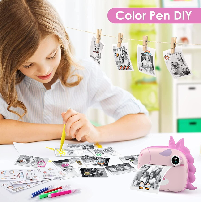 [BEST DIY CAMERA GIFT FOR KIDS] This kids camera is both a digital camera and an instant print camera for kids which allows kids to take colour images, record 1080p HD videos and print black & white photos. Moreover, this instant print camera also comes with 3 cutes cartoon stickers, 5 coloured pens, and 10 photo clips for DIY to stimulate children’s imagination and creativity. Ideal Birthday/Christmas/Daily gift for kids age 3-14.