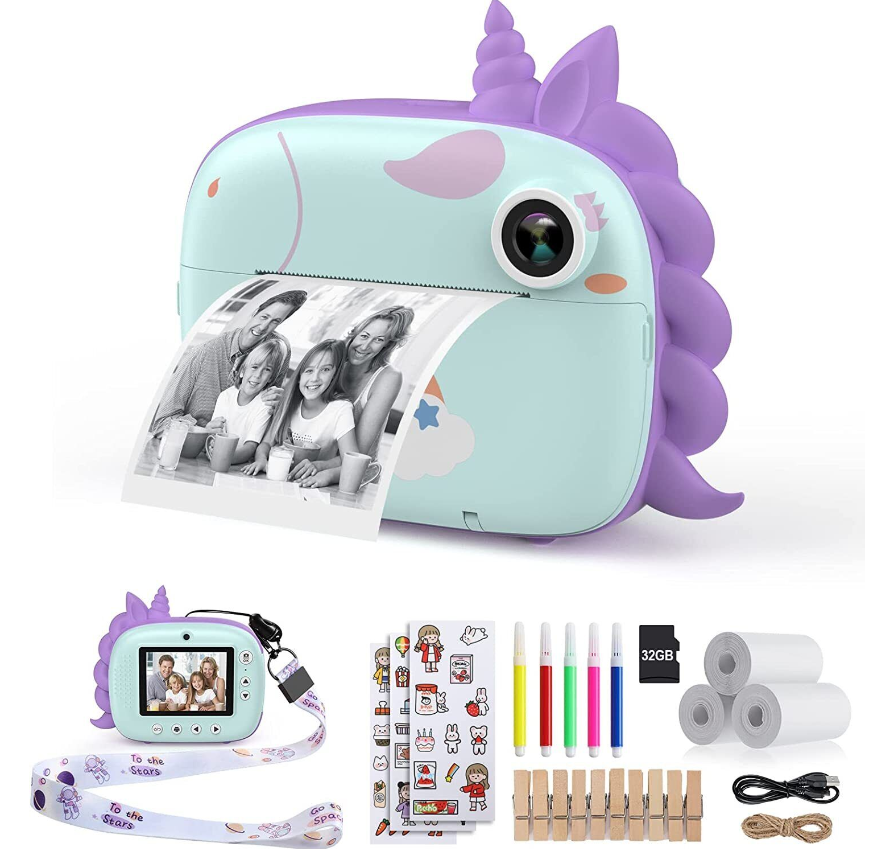 [ZERO INK INSTANT PRINT CAMERA FOR KIDS] This kids instant camera adopts advanced zero ink technology to print without toner. Kids can instantly freeze and print images on 2.16*3.15inch (5.5*8cm) skin-friendly paper in seconds with a simple press. (3 Rolls Print Paper for up to 150 photos are included in the package)
