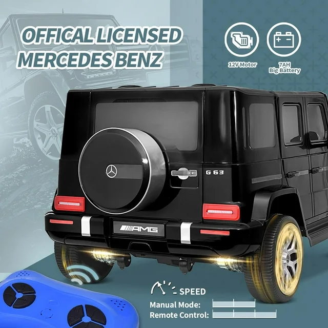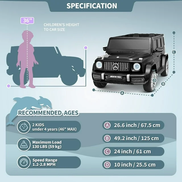 Joywhale 2-Seater Kids Ride on Licensed G63 has almost restored the real car's appearance, the luxurious and realistic appearance can give kids an excellent driving experience. And equipped with large 2-seater & powerful power configuration, which can provide strong power on various terrains for two kids. The 20" extended seat can give kids more comfortable driving experience. Kids also can enjoy a comfortable and smooth driving thanks to the four-wheel suspension and the soft braking system. The bumps on rough roads and the shock during braking can be significantly reduced. The seat belt and safety door lock can also protect little drivers' safety. Additionally, there is an emergency brake button on the remote control, which can stop the car immediately in case of an emergency. And it also provides various functions, Music/ FM Radio/ Bright Headlights/ Horn and more, kids can enjoy the fun of lights and music while driving. At the same time, it comes with a portable handle and folding wheels for easy carrying.