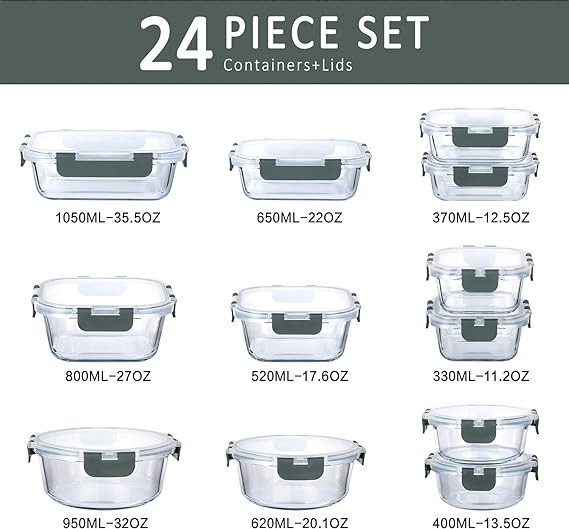 24-PIECE FOOD CONTAINER SET: 12 Containers with 12 lids with multiple sizes and shapes to fulfill your storage requirement. Package includes: 1 (35.5 oz), 1 (22 oz) 2 (12.5oz ) 1 (27 oz) 1 (17.6 oz) 2 (11.2 oz) 1 (32 oz) 1 (20.1 oz) 2 (13.5 oz) container with lids.