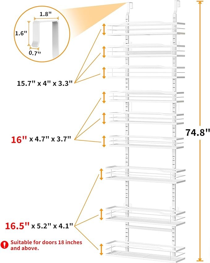 Quick & Easy Installation: No tools or drilling are required to install our pantry organizer over any standard door. This makes it a hassle-free storage solution that won't damage your walls or doors.