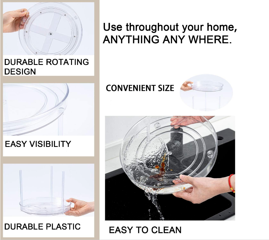 【Safe material】Lazy Susan is made of superior plastic.【Rotating 360° design】Easy to spin and keeps all your items neatly without digging around while being easily accessible.【High outer wall】 To prevent items from sliding around while the organizer is in motion.