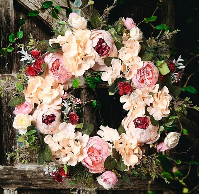 • REALISTIC PRESENTATION: A spring wreath of faux peonies and champagne-colored hydrangeas surrounded by newly sprouted eucalyptus leaves. The peonies are surrounded by a number of smaller flowers, which add to the fullness and vibrancy of the peonies. It looks realistic and natural. The wreath is made of silk and has a natural vine ring on the back. The whole garland looks lifelike and full of life, giving a romantic and artistic feeling.