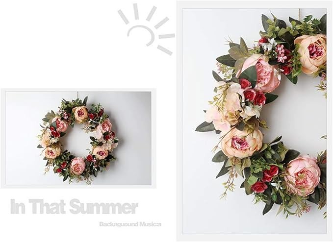Peony Spring Wreath for Front Door, Handmade Pink Floral Wreath Artificial Spring Garland Wreath for Front Door Wall Wedding Party Home Deco