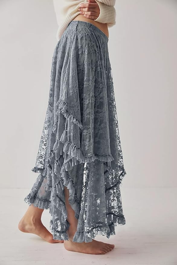 • DESIGN: This long skirt looks nice and understated that has elasticity at the waist, which flexible fit your waist size and makes you comfortable to wear. Lace print pair with a fluffy and layered hem to this cute skirt brings a sexy and romantic vibe. Wearing this boho skirt pair with other styles of tops or bikinis to walk on the beach that will be a unique and beautiful scenery!