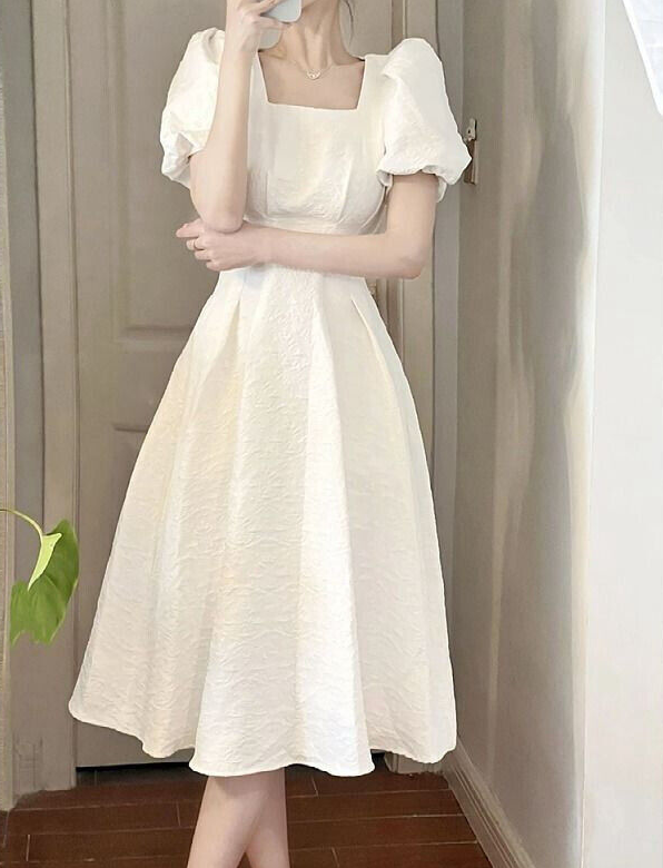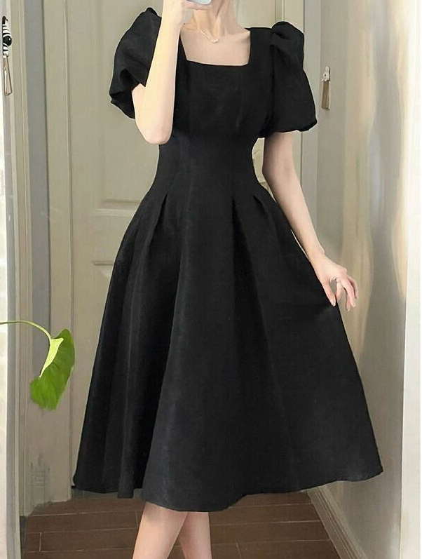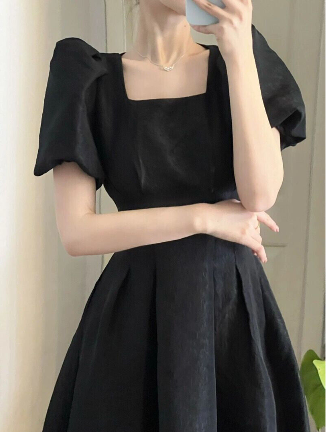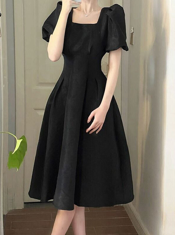 * Item:Womens Elegant Square Short Neck Puff Sleeves Slim Fit Summer Party Midi Dress * Condition: 100% Brand New * Color:Black White * Size:Asian * Package:1pc Dress (without any accessories )